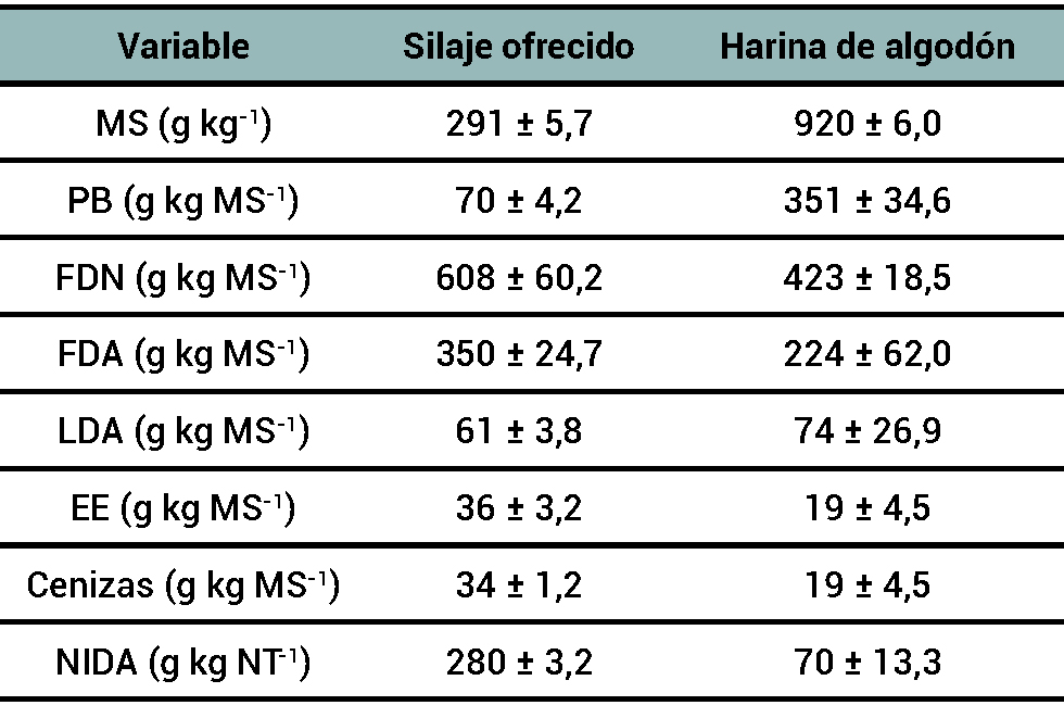 El contenido de FDN y FDA fue superior al encontrado como promedio en la bibliografía, sin embargo, se encuentra dentro de parámetros aceptables.