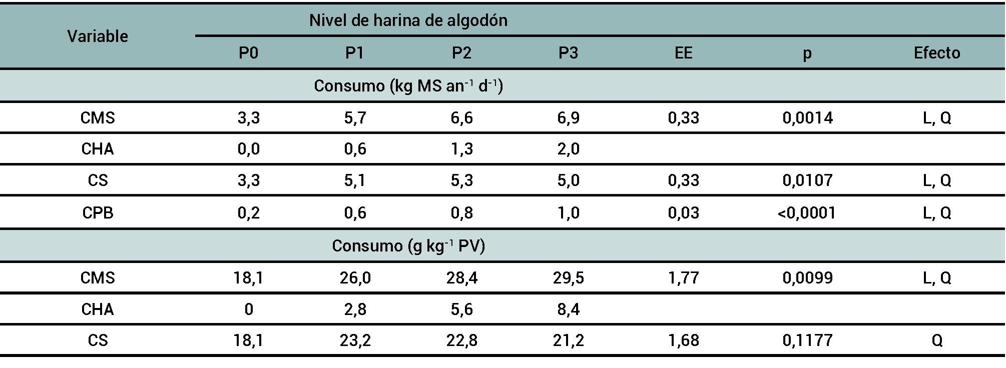 La tasa de cambio de consumo (CR = (CSPn-CSP0)/HAn; CSPn: Consumo de Silaje del n-ésimo tratamiento, kg MS an-1 d-1; CSP0: Consumo de Silaje del tratamiento P0, kg MS an-1 d-1; HAn: Harina de algodón de n-ésimo tratamiento, kg MS an-1 d-1) cuantifica el cambio en el consumo de forraje base por unidad de suplemento consumido (Moore y Kunkle, 1995). Se observó una disminución en el incremento del CS, a medida que se incrementó la suplementación. Esto se reflejó en las CR que fueron 1,82, 0,84 y 0,37 para los niveles de 2,8, 5,6 y 8,8 g kg-1 PV de HA, respectivamente. Esto indica que el primer nivel de suplementación fue el de mayor eficiencia por unidad de suplemento suministrado.