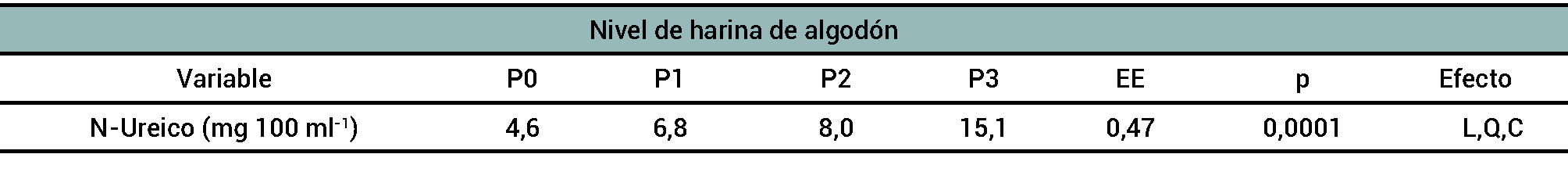 El nitrógeno ureico en sangre (NUS) se incrementó significativamente (p>0,05) con el aumento de los niveles de suplementación (tabla 3). Esto concuerda con Balbuena et al. (2002a) que obtuvieron valores de 4,3, 11,3, 13,7 y 22,3 mg 100 ml-1 en vaquillas alimentadas a base de heno suplementadas con harina de algodón a niveles de 0, 3,5, 7,0 y 10,6 g kg-1 PV. Hammond (1992) informa que la concentración de NUS se incrementó de 2,6 a 11,1 mg/100ml cuando la dieta pasa de 60 a 180 g kg-1 de PB.