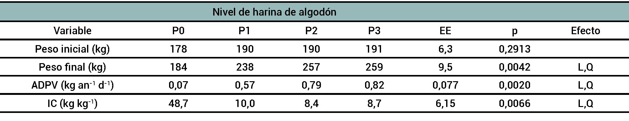 La suplementación con harina de algodón hasta el nivel de 6 g kg-1 PV mejoró el consumo de silaje y de materia seca total, mejorando también la ganancia de peso de los animales y el índice de conversión del alimento, merced a una mejora en el balance de la relación entre energía y proteína de la dieta.