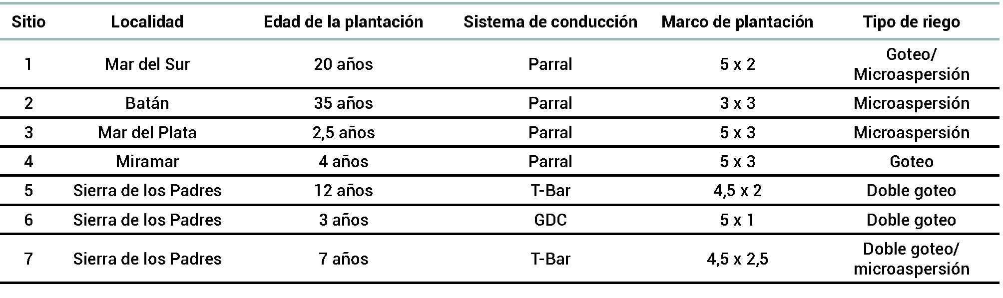 El estudio se llevó a cabo en 7 campos de productores de kiwi (Actinidia chinensis var. deliciosa “Hayward”) del sudeste bonaerense entre octubre y noviembre de 2016. El establecimiento 1 se localizó en Mar del Sur, el 2 en Batán, el 3 en Mar del Plata, el 4 en Miramar y los 5, 6 y 7 en Sierra de los Padres. Los cultivos de los establecimientos presentaban diferentes edades, tipos de riego, sistemas de conducción y marcos de plantación (tabla 1). En lotes (sitios) seleccionados de cada uno, se realizaron calicatas basadas en un protocolo establecido de 1,20 x 1,20 x 0,75 m, ubicadas a 0,6 m del tronco y en dirección de la línea de plantación. El centro de la calicata se ubicó a la altura del tronco de la planta. En los establecimientos 2, 3 y 7 se realizaron 2, 3 y 2 calicatas respectivamente en diferentes lotes del mismo campo.