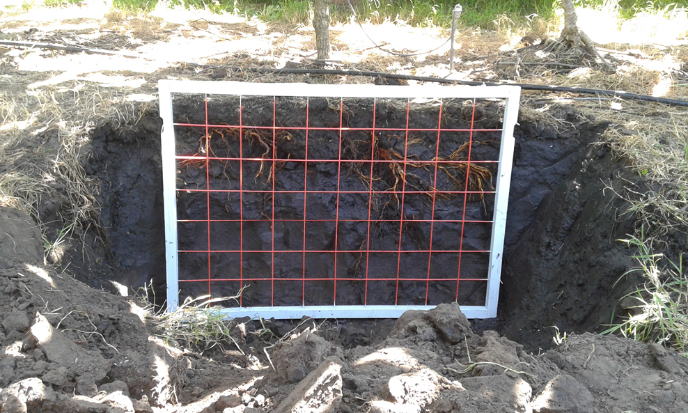 Para poder realizar un buen diseño y manejo del riego es necesario conocer la arquitectura de raíces en el eje vertical. Dicha arquitectura está representada por su distribución (densidad y ocupación) y conformación (proporción de raíces finas ≤ 2 mm, y estructurales o gruesas > 2 mm; Lemon, 1986) y posibilitaría calcular la lámina de agua útil del suelo por hectárea en función del volumen de suelo efectivo explorado por las raíces del cultivo. Actualmente, no hay estudios sobre la arquitectura de raíces del kiwi cultivado en la zona, por lo que los productores carecen de una guía para realizar el riego.