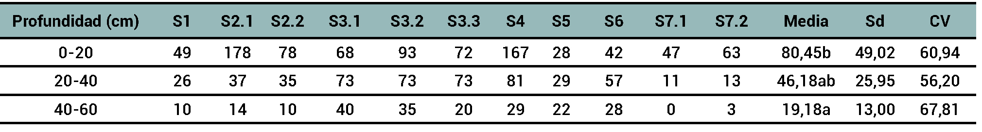 Elaboración propia.A pesar de las diferencias entre lotes en el manejo y edad del cultivo, todos los sitios tuvieron en común la concentración de raíces en los primeros 40 cm de profundidad del suelo. Las características del suelo condicionan la profundidad alcanzada por el sistema radical (Hodge et al., 2009). En el Alto Valle de río Negro, en manzanos se informó el efecto negativo de la rastra de suelo en la ocupación de raíces en los primeros centímetros de profundidad como así también el efecto de la capa freática y de las compactaciones de suelo (Aruani y Sánchez, 2004). En este estudio, la escasa profundidad radical habría estado relacionada principalmente con la distribución de los horizontes del suelo, puesto que la textura franco-arcillosa y arcillosa observada por debajo de los 40 cm de profundidad se constituiría en una limitación para las raíces. Hasey (1994) afirmó que ante la presencia de horizontes restrictivos la profundidad de raíces se iguala a la profundidad del horizonte en cuestión. La distribución superficial de raíces coincide con lo observado por Xiloyannis et al. (1993) y Warfield y Seim (1992). Las discrepancias halladas por otros autores como Gandar y Hugues (1988) se deberían entonces a las diferencias en el tipo de suelo, puesto que evaluaron suelos franco-limosos y franco-arenosos, en donde las raíces alcanzaron mayor profundidad. Al respecto, Hasey (1994) menciona que en Nueva Zelanda se han encontrado raíces a una profundidad de 3 m en suelos franco-limosos y franco-arenosos. En cambio, en suelos más someros el sistema radical ha alcanzado como máximo los 70 cm de profundidad del suelo.