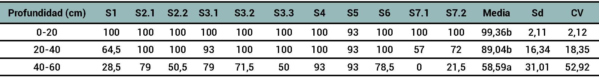 El mayor porcentaje de ocupación de raíces totales de kiwi se concentró en los primeros 40 cm de profundidad del suelo (P<0,01; tabla 3). Independientemente de la densidad, el porcentaje de ocupación en los 0-20 cm de profundidad fue del 100% en casi todos los sitios, a excepción del 5. Quizás, un menor contenido de materia orgánica en el suelo del sitio 5 haya influido en estos resultados y en el menor número de raíces respecto al resto de los sitios (tabla 2). Si bien no hubo diferencias estadísticas significativas en el porcentaje de ocupación de raíces entre los 0-20 y 20-40 cm, se observó una tendencia de una disminución gradual del porcentaje de ocupación entre dichas profundidades, mientras que la reducción fue estadísticamente significativa por debajo de los 40 cm de profundidad del suelo (P<0,01; tabla 3).