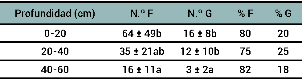 Número de raíces finas (N.º F), gruesas (N.º G), y porcentaje de raíces finas (% F) y gruesas (% G) respecto al total.