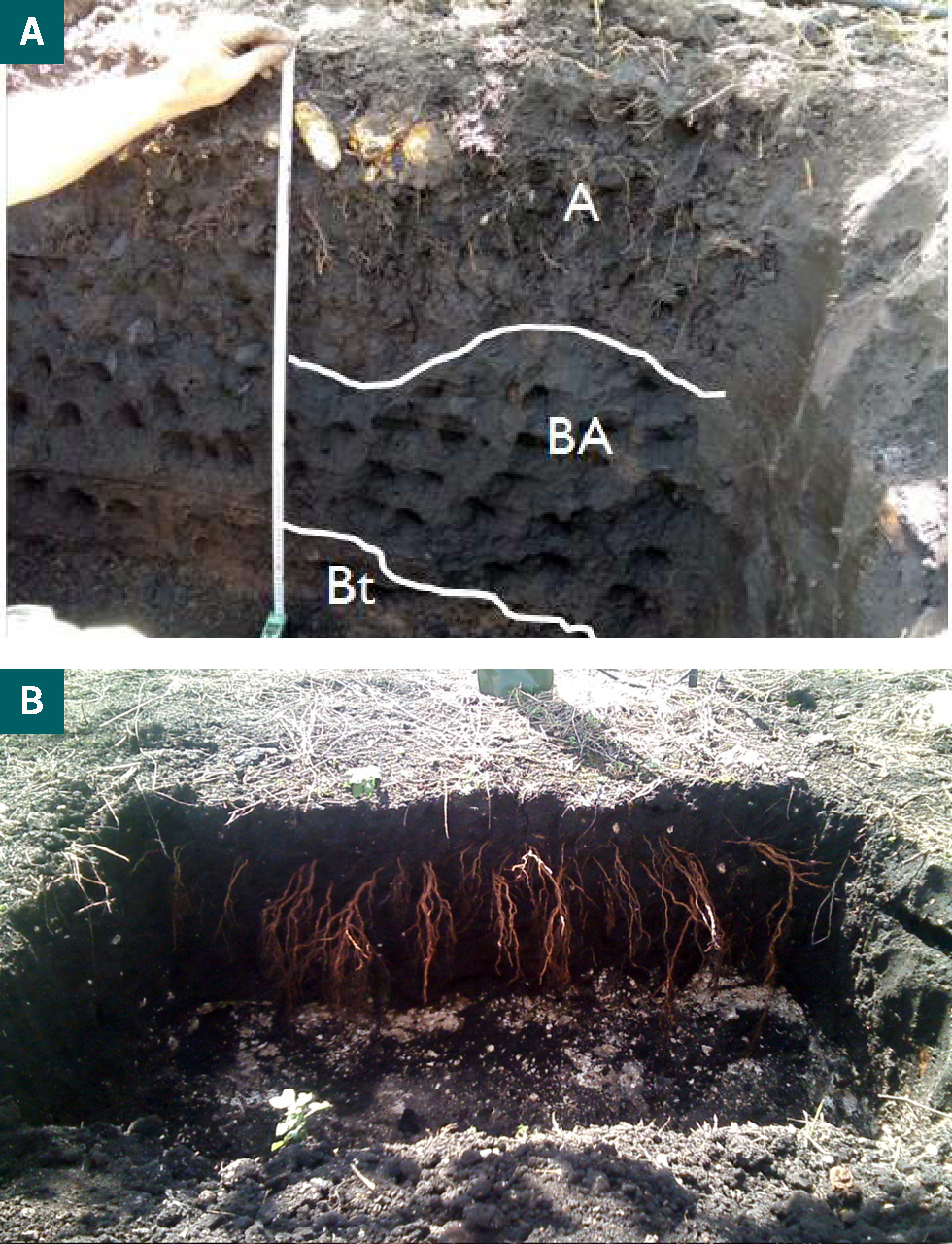 Algunas limitaciones para el desarrollo de raíces de kiwi. A. Compactación en los horizontes AB-BA y presencia de horizonte Bt. B. Tosca a partir de los 60 cm de profundidad del suelo.