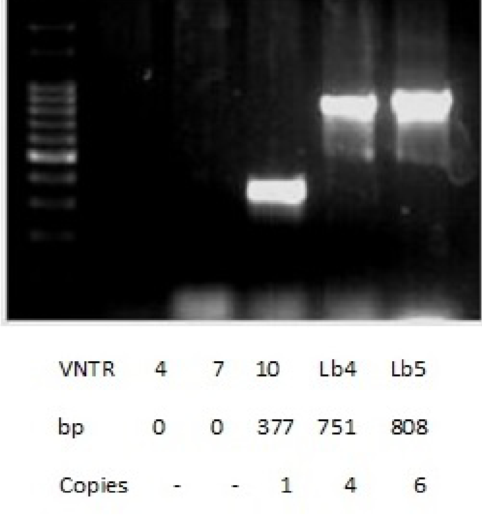 Caracterización molecular: las cepas de referencia y la cepa aislada se cultivaron en medios Fletcher (Laboratorios Difco) a 28 ºC. Para las extracciones de ADN se usó el protocolo utilizado con la resina Chelex-100 (Bio Rad). Se usó el análisis de repeticiones en tándem de número variable de locus múltiples (MLVA) para caracterizar la cepa aislada con 1 conjunto de oligonucleótidos específicos para las cepas patógenas de L. interrogans, L. kirschneri y L. borgpetersenii, se usaron los siguientes loci: VNTRS: 4, 7, 10, Lb4 y Lb5 (Salaün et al., 2006). El volumen final (50 µl) de cada mezcla de reacción contenía PCR Buffer (Tris-HCL 20 mM, pH 8.4; KCl 50 mM), desoxinucleósidos trifosfatos 200 µM, cada cebador correspondiente 2 µM, MgCl2 2 mM, ADN polimerasa Taq 1.25U (Invitrogen) y plantilla de ADN 5 µl. Las PCR se llevaron a cabo en un termociclador Thermo Scientific PxE 0,2 de la siguiente manera: 94 ºC durante 5 minutos, seguido de 35 ciclos de desnaturalización a 94 ºC durante 30 segundos, recocido a 55 ºC durante 30 segundos y extensión a 72 ºC durante 90 segundos, con un ciclo final a 72 ºC durante 10min. Las muestras amplificadas (15 µl) se revelaron mediante electroforesis en un gel de agarosa al 2% en tampón TAE (Tris-acetato 40 mM, EDTA 1 mM) con 0,2 ul µg/ml de bromuro de etidio a 100 V durante 50 minutos. Las bandas de ADN amplificadas se visualizaron tras la exposición a la luz UV (transiluminador Uvi Tec BTS-20.M). Los tamaños de amplicón se estimaron usando CienMarker (Biodynamics) y el programa GelAnalyzer 2010a. Para calcular el número de copias repetidas se utilizó la siguiente fórmula: Número de repeticiones (pb) = [Tamaño de fragmento (pb) - Regiones de flanqueo (pb)] / Tamaño de repetición (pb). Los números de copia repetidos se redondearon a los números enteros más cercanos. Si el número de copia era menor que uno, se redondeó a cero.