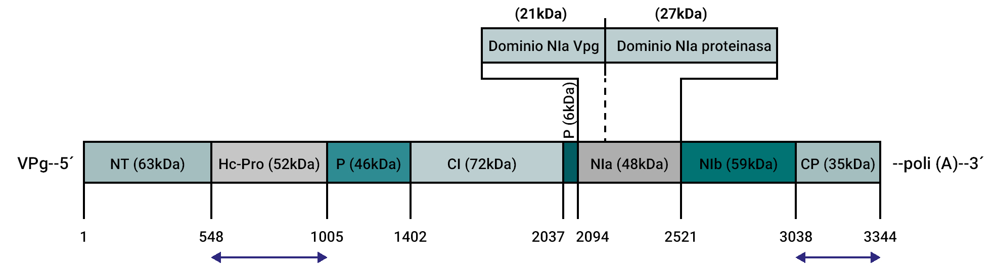El genoma del PRSV codifica para una poliproteína de 3344 aminoácidos (Yeh et al., 1992; Azad et al., 2014), y de acuerdo a la figura 1, en donde se muestra el mapa propuesto de las secuencias de proteínas y sus tamaños moleculares: proteína NT (63 kDa), HC-Pro (52 kDa), P (46 kDa), CI (72 kDa), 6 kDa, NIa (48 kDa), NIb (59 kDa), CP (35 kDa).