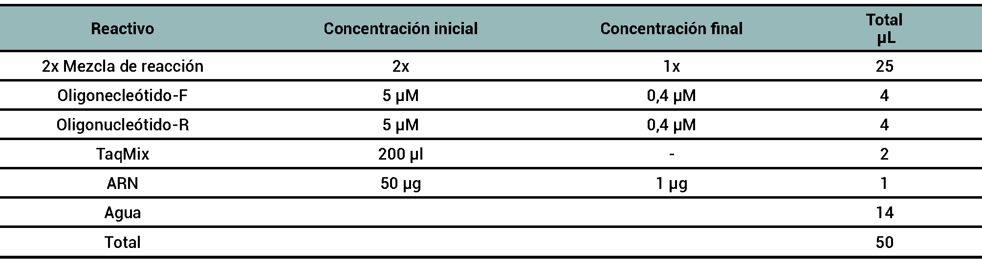 Reactivos para la reacción de RT-PCR. La tabla muestra las concentraciones iniciales, finales y el volumen para usar por cada reacción.