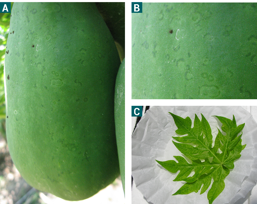 Elaborada para la presente edición.Plantas seleccionadas para realizar la colecta de tejido. (A) Fruto de papaya con los síntomas característicos del PRSV. (B) Acercamiento de la región con los anillos propiciados por el PRSV. (C) Hoja extraída que fue colocada en papel filtro para posteriormente ser deshidratada y procesada.