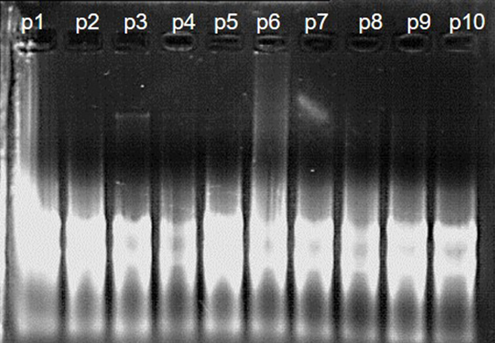 Elaborada para la presente edición.Análisis de la extracción del ARN. Visualización de ARN de diez plantas (p1 a p10) a partir de hojas de papaya previamente deshidratadas con silica gel que presentaron síntomas visibles del agente viral, con el uso de TRizolTM. La integridad del ARN fue comprobada cargando 2 µL de cada muestra en un gel de agarosa al 1,2% (p/v).