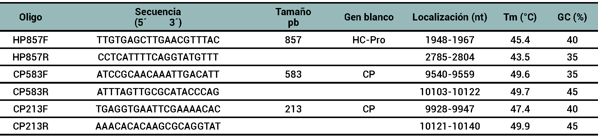Para conocer las regiones conservadas se sometieron las 27 secuencias de PRSV obtenidas de GenBank a un proceso de alineamiento por Clustalw. Se seleccionaron dos regiones del genoma viral que codifican para la proteína Helper component (HC-pro) y la proteína de la cápsida (CP). Para el caso de la región HC-Pro que comprende de 1727 nt a 3097 nt se obtuvo una pareja de oligonucleótidos que se etiquetaron como (HP857F y HP857R), por el tamaño del fragmento de 857 pb que se espera que amplifique del genoma viral. Los oligonucleótidos restantes se diseñaron en la región que codifica para la proteína de la cápsida. Estos se denominaron CP583F-CP583R y CP213F-CP213R porque amplifican fragmentos de 583 pb y 213 pb, respectivamente. En la tabla 2 se resumen los productos de amplificación de los iniciadores específicos diseñados en conjunto con parámetros como temperatura de fusión (Tm) y porcentaje de contenido de guanina:citosina (%GC) de cada oligonucleótido. Con el desarrollo de los análisis in silico, con el programa Primer Select se confirmó que las parejas de los iniciadores amplificaron los fragmentos de acuerdo a su diseño y no amplifican en ninguna otra región de la secuencia analizada en GenBank.
