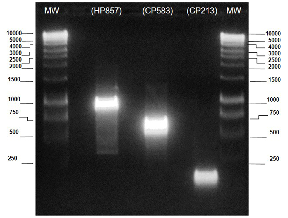 Las tres parejas de oligonucleótidos HP857F-R, CP583F-R y CP213F-R amplificaron de manera exitosa los tres fragmentos esperados de acuerdo a su diseño y validado por los análisis in silico.