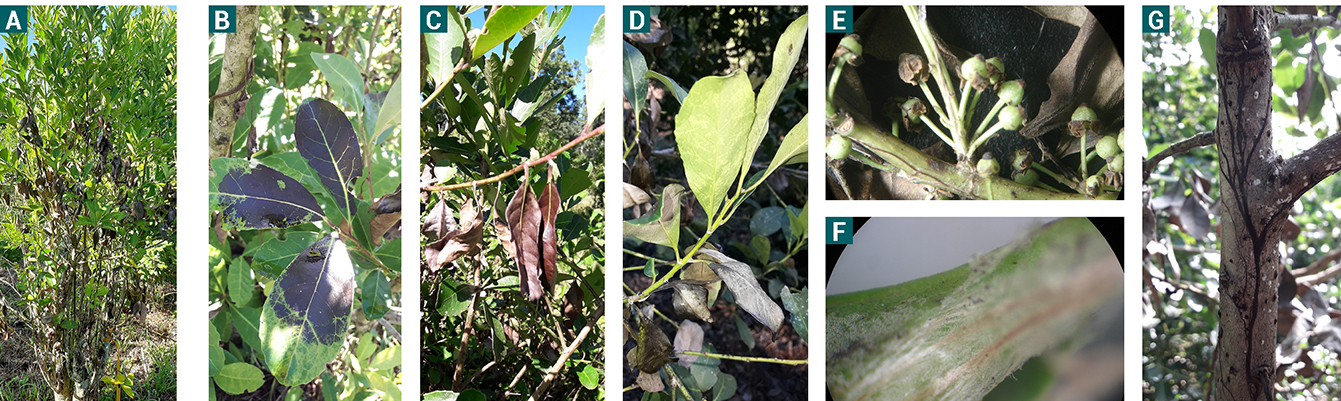A) Sintomatología observada en plantas afectadas por C. niltonsouzanum, los primeros síntomas comienzan en la parte media de la copa, en los brotes internos. B) A medida que el hongo penetra en el tejido las hojas se vuelven negras. C) Las hojas secas quedan unidas al tallo por el micelio del hongo. D) El envés de las hojas pierde su brillo natural. E) Formación de micelio en tallos y frutos. F) A medida que avanza la enfermedad el micelio cambia de un color blanquecino a marrón oscuro. G) Formación de esclerocios en tallos cuando las condiciones ambientales son desfavorables para el desarrollo de la enfermedad. Elaborado para la presente edición.