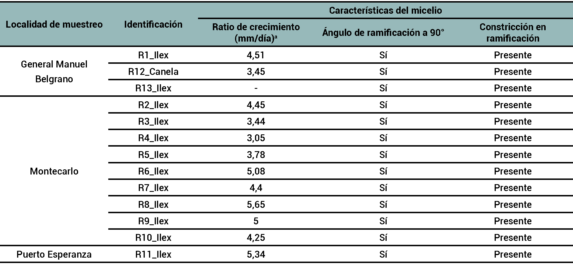 De los dos métodos que se probaron para el aislamiento del hongo, se obtuvieron mejores resultados pegando las hojas de yerba infectadas con el micelio del hongo en la tapa de la caja de Petri porque hubo menos contaminación con otros microorganismos. Este método permitió obtener puntas de hifas fúngicas puras de diferentes localidades de Misiones (tabla 1). Además, se observaron estructuras sexuales, como basidios con formación de basidiosporas.