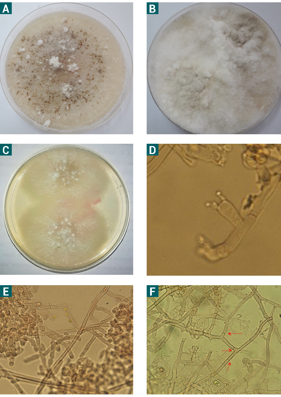 Elaborado para la presente edición. a Media de 3 repeticiones.Las colonias crecieron rápidamente en el medio APG. Al principio, las colonias son de color blanco y luego se tornan de color crema a marrón claro (tabla 1). La caracterización microscópica se realizó con un aislado puro. El micelio presentaba ramificaciones cerca del tabique distal de las células hifales en ángulo recto, en hifas viejas, con producción de células moniloides. El ángulo de ramificación característico del micelio se observó en un total de 20 aislamientos bajo un microscopio binocular. Esta caracterización morfológica es consistente con miembros del hongo del género Rhizoctonia (figura 2. A-F).