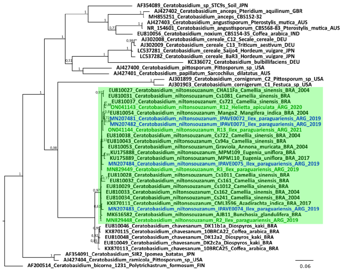 Árbol filogenético obtenido mediante Inferencia Bayesiana a partir de las secuencias de la región del espaciador transcrito interno (ITS). Los valores de probabilidad posterior bayesiana se muestran en los nodos. Las secuencias de C. niltonsouzanum de este estudio están en verde y otras secuencias de Argentina en yerba mate en azul.