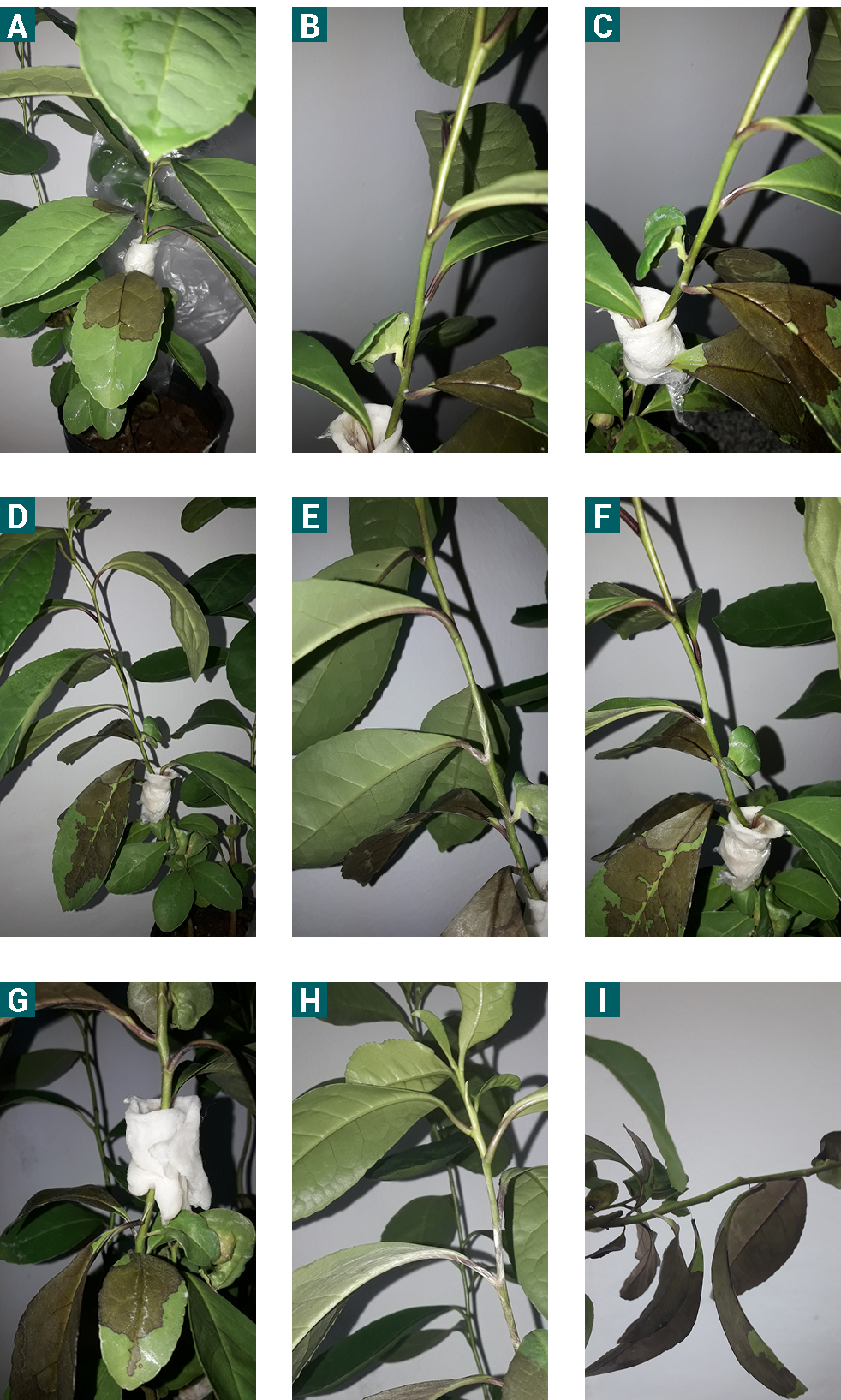 Planta de yerba mate inoculada con C. niltonsouzanum obtenida del aislamiento de la punta de la hifa. A, B, C) 12 días después de la inoculación, en la imagen A se puede observar el inicio de la infección. D, E, F) 16 días después de la inoculación, imagen E formación de micelio en hojas superiores; F formación de micelio en la axila de la hoja. G, H, I) 19 días después de la inoculación, la imagen H muestra el desarrollo del micelio en el tallo y el pedicelo de la hoja; la imagen I muestra hojas desprendidas que cuelgan del micelio del hongo.