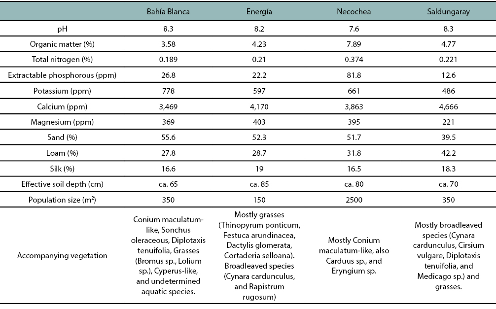 Chemical and physical soil properties, population size, and accompanying vegetation of common teasel at Bahía Blanca, Necochea, Energía, and Saldungaray locations in Buenos Aires province during seed production study.