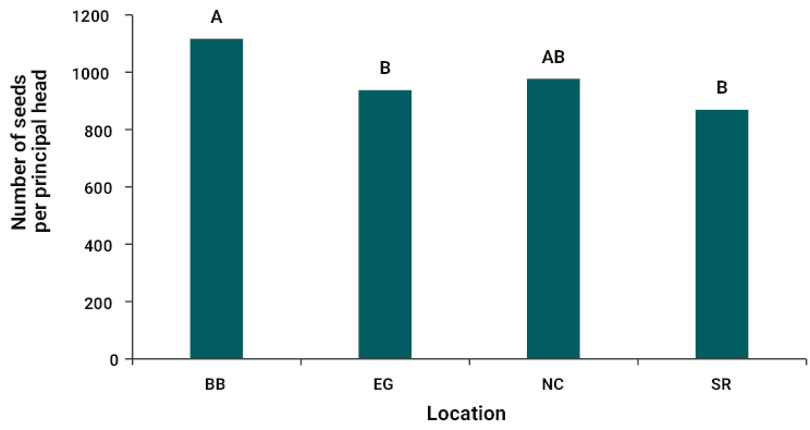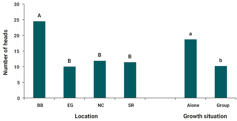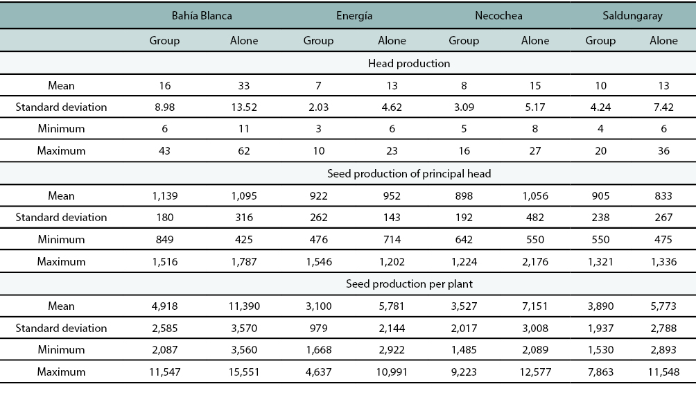 Number of heads per plant, seeds per principal head, and total seed production per plant results are shown in table 2. No interaction between locations and growth situation for the number of heads was observed (F=1.43; p=0.24). However, significant differences were detected between locations (F=25.78; p<0.01) and between growth situations (F=63.92; p<0.01) for the number of heads. Across growth situations, the lowest number of heads per plant was three, detected in Energía, and the highest was 62 in Bahía Blanca. Across locations, head production of plants growing alone was 46% higher than plants growing in groups (fig. 2).