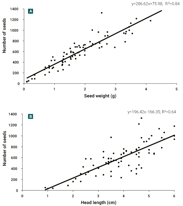 The experiment was conducted as a completely randomized design. Data were subjected to two-way Analysis of Variance (ANOVA), considering location (Bahía Blanca, Saldungaray, Necochea, and Energía) and growth situation (alone or in groups) as fixed factors. Means were separated using Fisher’s Protected Least Significant Difference test at p<0.05. Previously, normality and variance homogeneity were evaluated through analysis of residuals. When it was necessary, data were transformed using Ln(x) transformation to achieve ANOVA assumptions (Snedecor and Cochran, 1956). Data were pooled over locations or the growth situation when no location by growth situation interaction was detected (p>0.05). Linear regression models were adjusted between head length and seed number, and also between seed weight and seed number, to estimate the total seed production per plant. Since seed weight showed a higher goodness-of-fit measure, it was used as an estimator of the total seed production. Analyses were performed using the statistical software INFOSTAT (Di Rienzo et al., 2015).