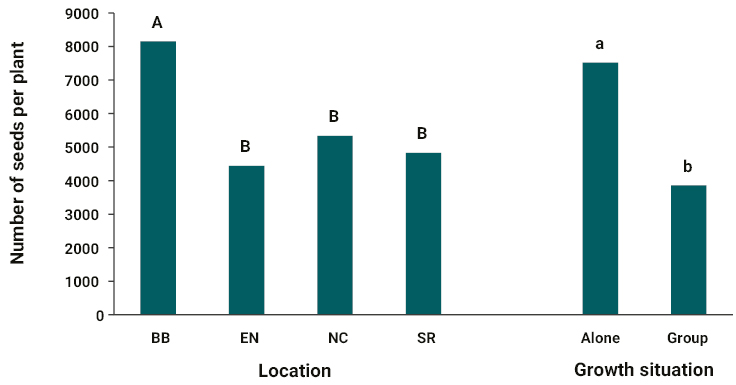 Regarding the total seed production, there was no interaction between locations and growing conditions in the populations evaluated in our study (F=1.64; p=0.18). Nevertheless, there were significant differences between locations (F=9.22; p<0.01) and between growing conditions (F=68.28; p<0.01) for the total number of seeds. Seed production per plant was 5,692 seeds on average, ranging from 1,485 (Energía, plants in a group) to 15,551 (Bahía Blanca, for plants alone). Seed production of plants growing alone was 48% higher than plants growing in groups (fig. 5).