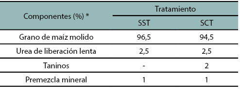 Los taninos utilizados fueron una mezcla comercial en polvo de complejos de polifenoles / catequinas de quebracho colorado (Schinopsis balansae). Se mezclaron con el resto de los componentes de la suplementación (maíz, urea de liberación lenta y premezcla mineral). La composición de la suplementación suministrada a las vacas de refugo para cada tratamiento estudiado (SST y SCT) se presenta en la tabla 1. Durante todo el ensayo, los animales se alimentaron con la dieta base sin restricción al consumo; y se suplementaron una vez al día en comederos lineales (40 cm/animal).