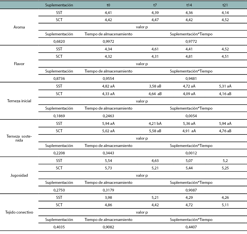 Los efectos de suplementación y tiempo de almacenamiento refrigerado no afectaron (P>0,05) a los atributos de aroma, flavor, jugosidad y tejido conectivo (tabla 2). Los atributos sensoriales de terneza inicial y sostenida resultaron afectados (P<0,05) por la interacción entre ambos factores principales, suplementación y tiempo de almacenamiento. Se puede observar que ambos atributos a los 7 días presentaron menores valores en el tratamiento SST frente al SCT. Este comportamiento podría deberse al porcentaje de mermas por cocción hallado en el presente estudio, cuyo valor a los 7 días de conservación refrigerada fue el más alto para las muestras de SST (datos no mostrados). No obstante, los resultados de terneza inicial y sostenida no muestran diferencias significativas, para las dietas con o sin taninos, entre el inicio y el final del tiempo de almacenamiento refrigerado.