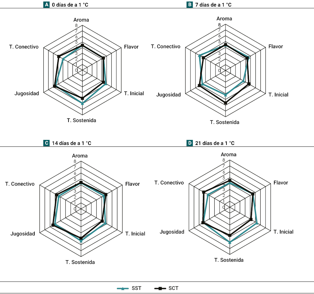 Valor medio de los atributos sensoriales del músculo SD cocido SV de vacas de refugo alimentadas a base de ensilaje de sorgo. SST: suplementación sin taninos. SCT: suplementación con taninos. A: 0 días a 1 ± 0,5 ºC, B: 7 días a 1 ± 0,5 ºC C: 14 días a 1 ± 0,5 ºC y D: 21 días a 1 ± 0,5 ºC .