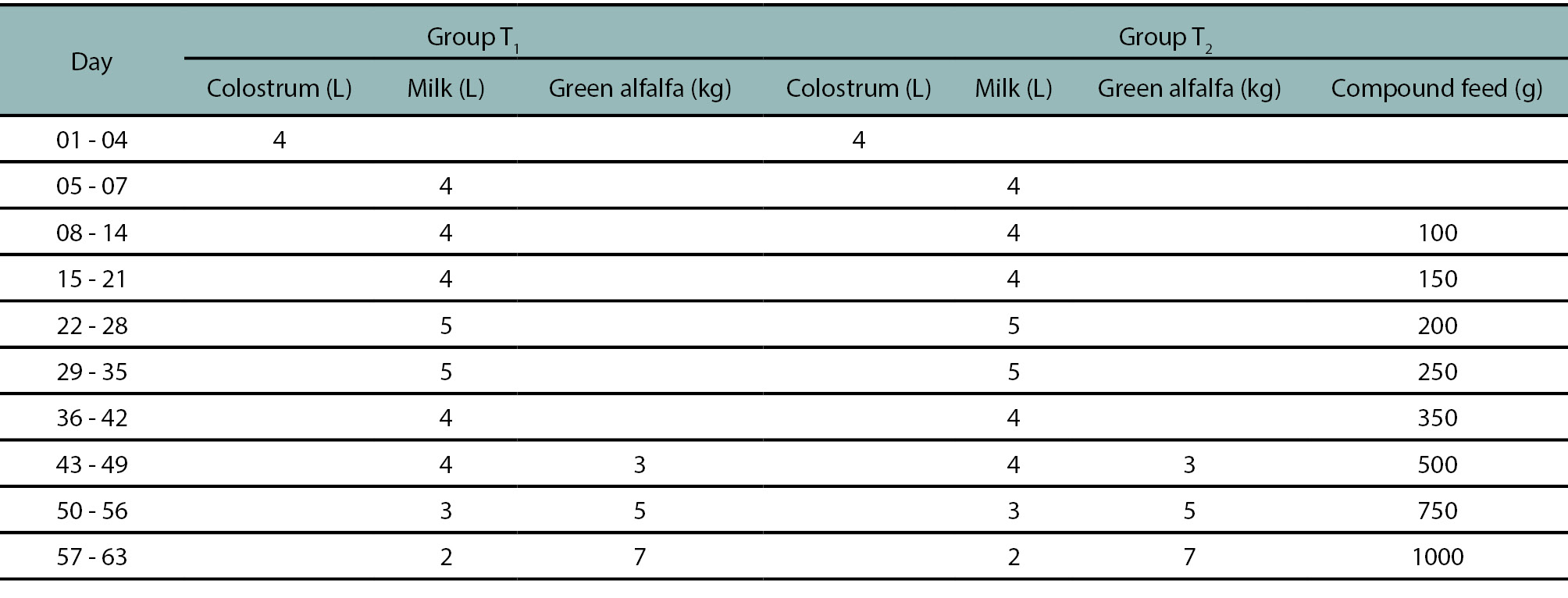 Feeding regimen applied to each calf within the two groups during the study period.