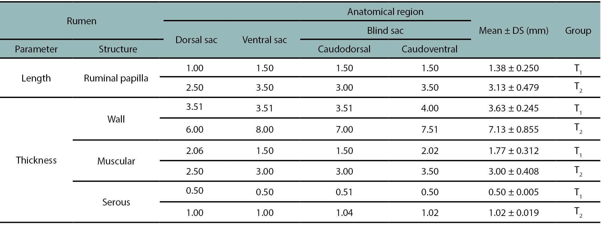 The averages and standard deviations of rumen papillae size measurements and rumen tissue thickness were calculated. The Student’s t-test was employed to identify differences between the averages of groups T1 and T2. A significance level of p < 0.05 was considered. The analyses were conducted using SPSS software version 27.0.1.