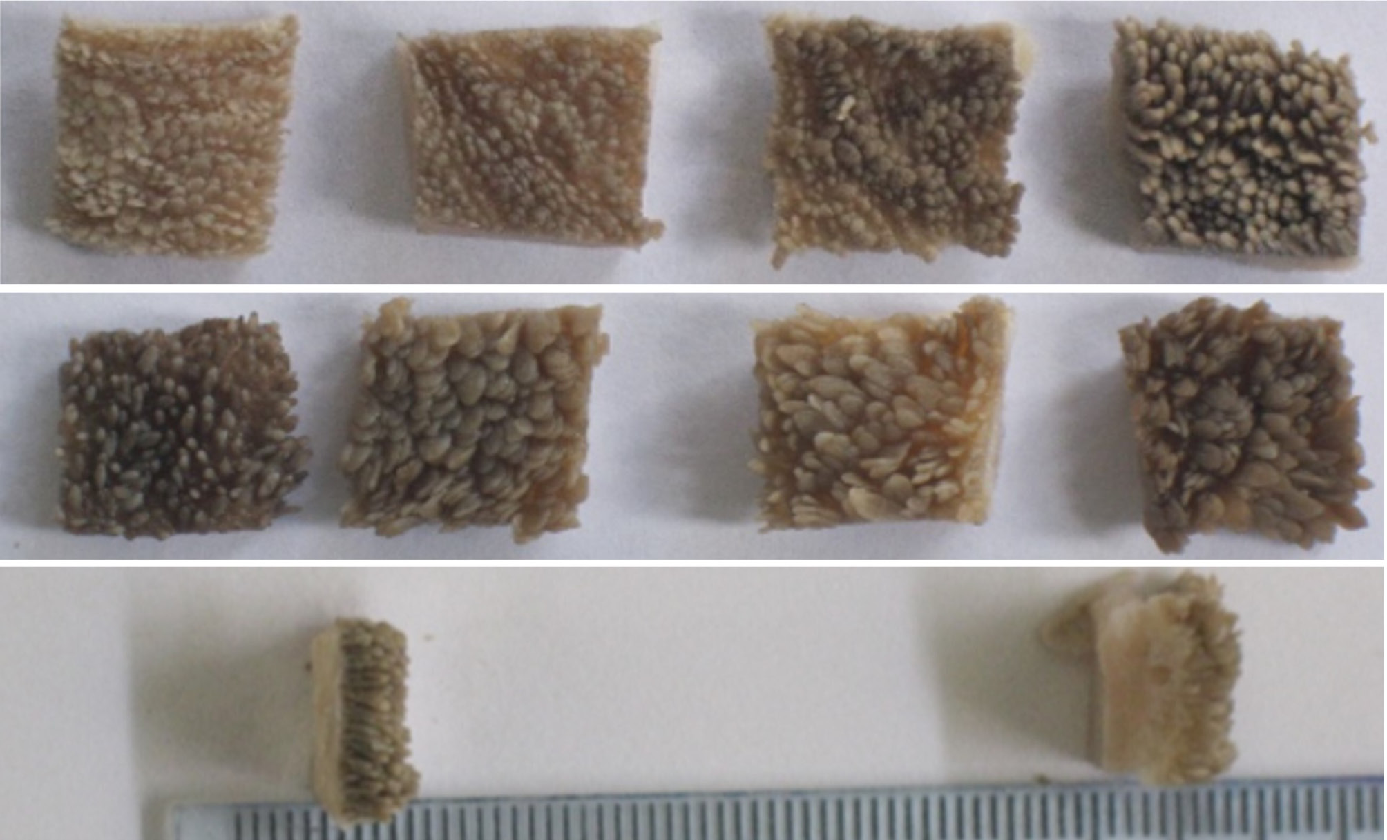 At the conclusion of the weaning process, calves were processed at the Camal Municipal de Cajamarca under the supervision of trained personnel. During postmortem examination, tissue samples (1 cm2) were collected from four anatomical regions of the rumen, specifically the dorsal rumen sac, ventral rumen sac, dorsal caudal blind sac, and ventral caudal blind sac. Subsequently, in the laboratory, the size of ruminal papillae and the thickness of tissue layers were measured using a millimeter ruler.