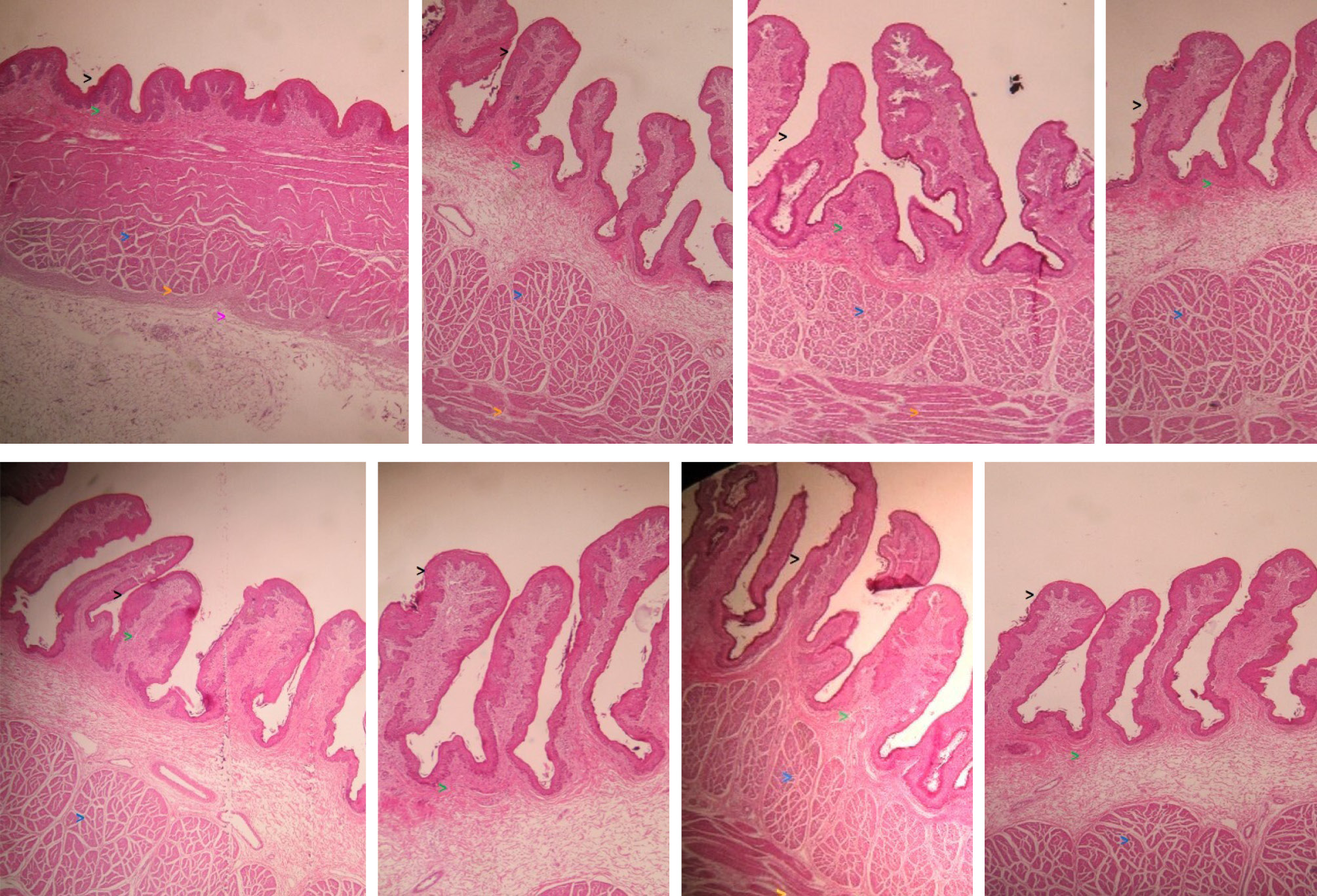 Histological findings of the rumen papillae in the different regions of the rumen according to T1 (Upper) and T2 (Lower). 1. Dorsal rumen sac, 2. Ventral rumen sac, 3. Caudo-dorsal blind sac, 4. Caudo-ventral blind sac., a. Ruminal papillae lined with a flat stratified epithelium of a bright pink color (>), b. Cell layer underlying the areolar connective tissue lining epithelium (>), c. Internal circular muscular layer (>), d. Internal circular muscular layer (>), e. Serous layer (>). (Hematoxylin-Eosin stain. 100X). The calves in T1 (n = 4) were exclusively fed with colostrum, milk, and fresh alfalfa. The calves in T2 (n = 4) received the same diet, along with a concentrated feed (CP 18%, CF 10%, fat 2.5%, moisture 14%, ash 8%, monensin 85 mg/kg).