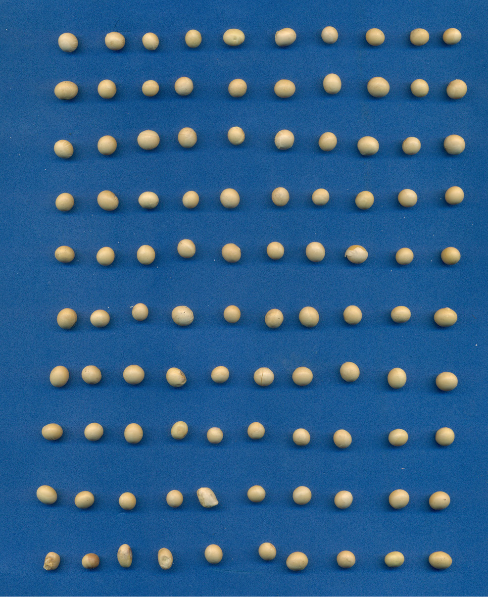 The soybean grain samples were extracted from a commercial package. A total of 9 samples, with 100 whole grains without visible cracks each, were prepared (figure 2), making a total of 900 grains. The selection of these grains was carried out at random for all cases, and they were extracted from a single package. The samples were visually inspected with the aid of a magnifying glass, and the number of grains in the samples were selected to fit on the document table of the scanner.