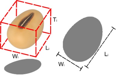Figure 1 shows a three-dimensional representation of a soybean grain. It shows the way in which a parallelepiped whose length Li (length), Wi (width) and Ti (thickness) coincide with the magnitudes of the grain can be approximated. Its volume can be described by equation (1).
