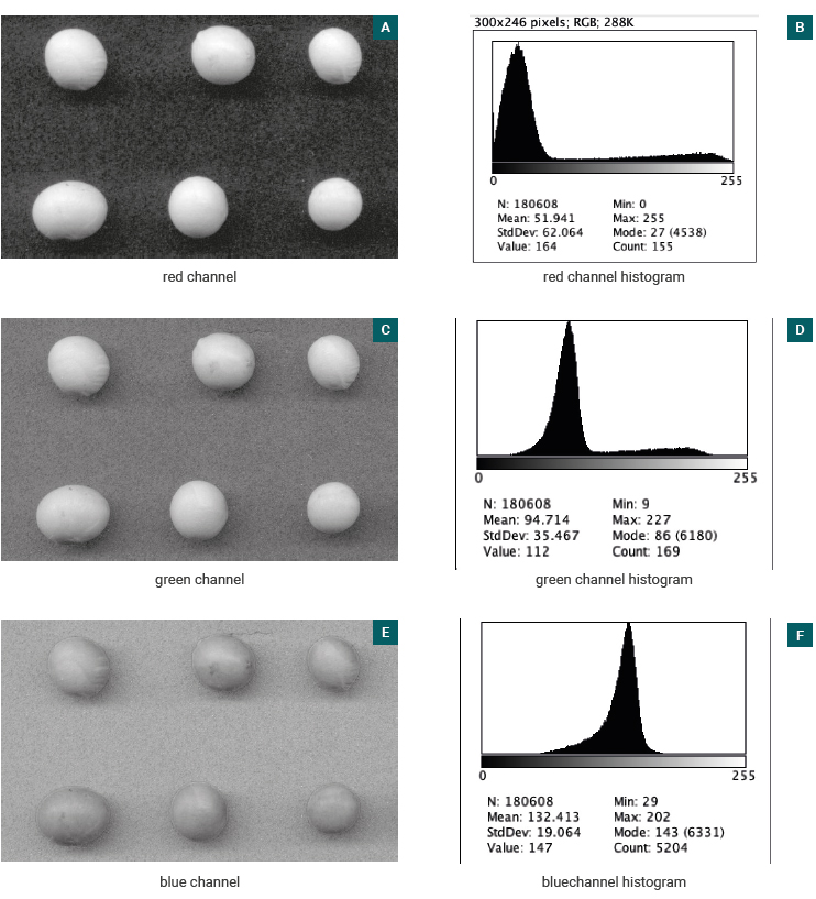 Before using this software, the first step was separating the images into RGB channels and selecting the one that generated more contrast between the grains and the background of the image. As shown in Figure 3, the red channel was selected for all images, since it was a better fit. We can see in figure 3(b) that its histogram presents a better contrast, and it will yield a cleaner image binarization.