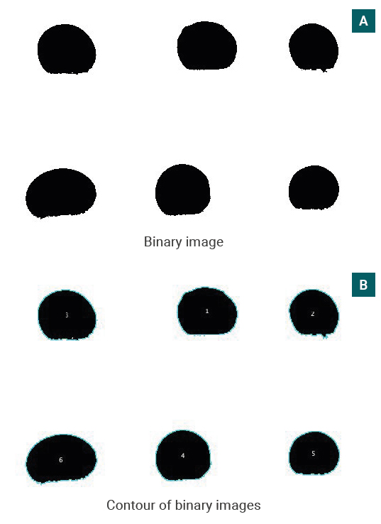 Once the image has been binarized, we can apply the analysis of particles to calculate the Feret maximum and minimum distances, which will be traduced to length and width of the grain (Broeke et al., 2015; Cleva et al., 2017).