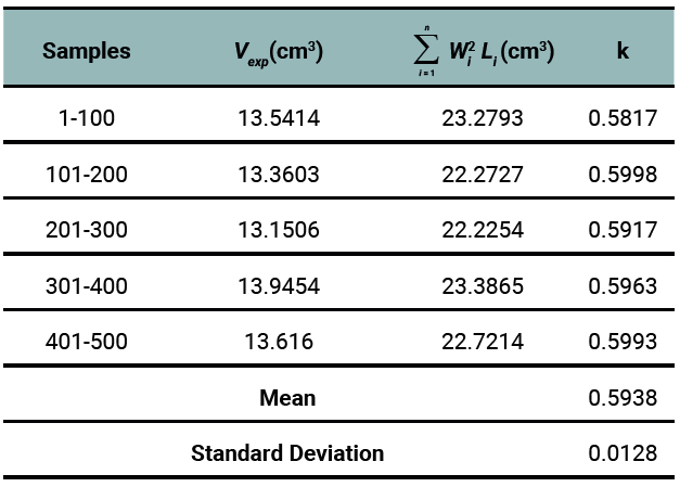 Table 1 presents, for each sample, the total number of grains that make it up, its experimentally determined volume , the sum of the square of the width times the length , and the corresponding constant k. Finally, the value of the constant k and its standard deviation are calculated.