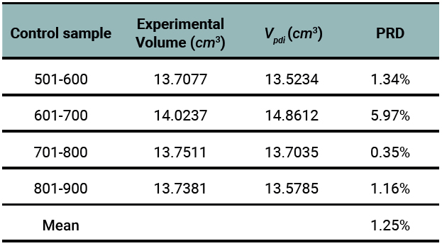 Table 2 shows the results of the model using the control samples for validation purposes. This table shows that the Percentage Relative Deviation of the control samples yields 1.25%, resulting in a good approximation by the control group.
