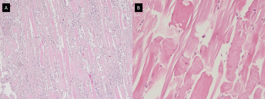 A. Histology of skeletal muscle showing segmental degenerative myopathy. A diffuse lesion with swelling, hyalinization, and fragmentation of myofibrils with macrophage infiltration and myoblast proliferation is observed (H&E, 4X). B. Severe fragmentation and hyalinization of muscle fibers with the formation of contraction bands and fibrin floccules (H&E, 20X).