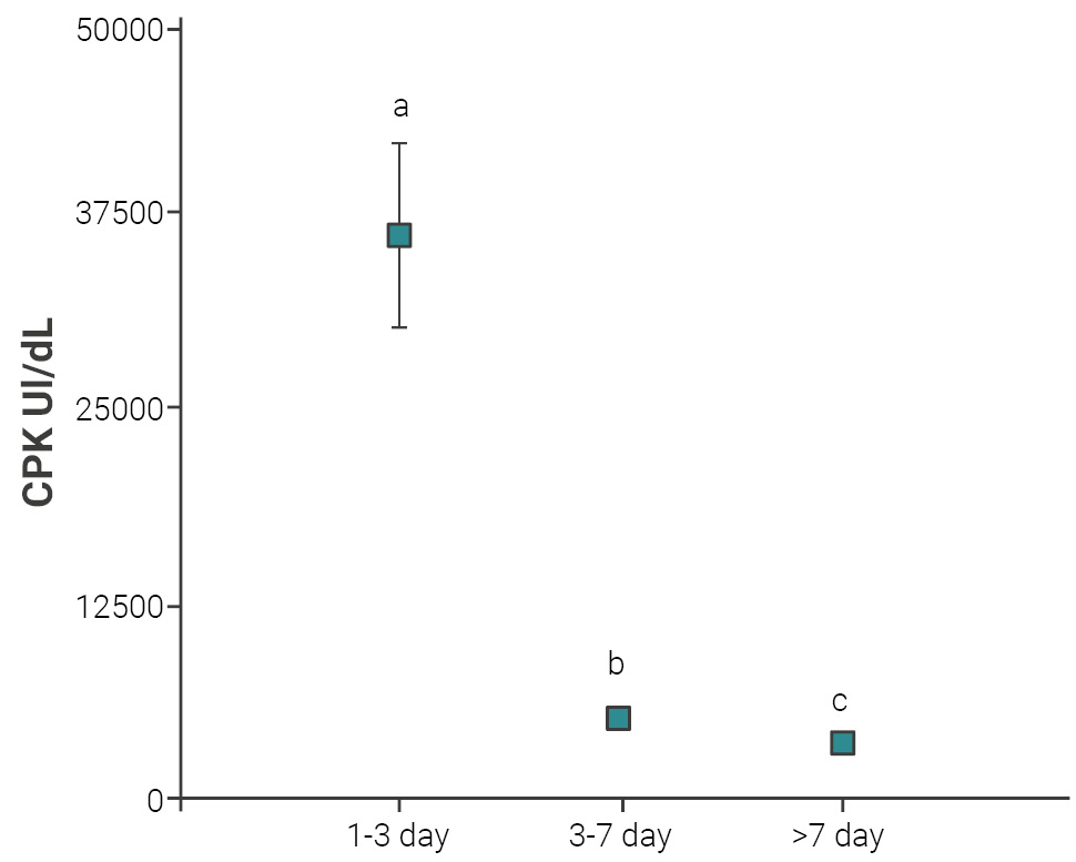 Creatine phosphokinase (CPK) levels in cattle according to different evolution times. The different letters indicate significant differences between groups.
