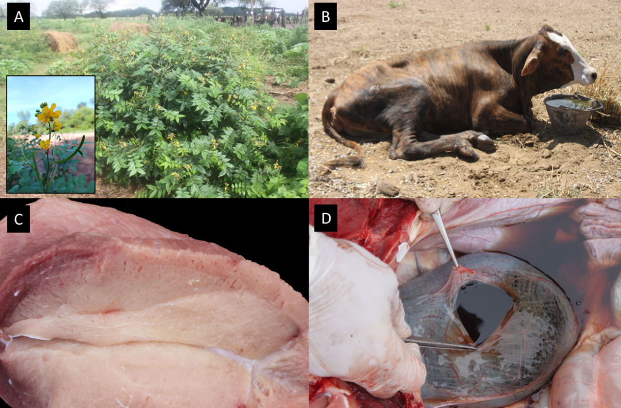 A. Adult Senna occidentalis plant in the fruiting stage. The insert shows the flowers and pods in erect position, which are distinctive for field identification. B. Affected animal in sternal recumbency with normal sensory status and inability to sit up. However, they keep the ability to eat and drink until their death. C. Striated skeletal muscle (triceps brachii) with degeneration and diffuse necrosis with an appearance resembling cooked meat. D. Dark-colored urine resulting from myoglobinuria.