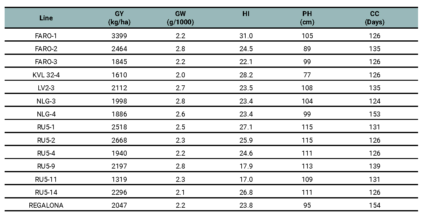 Grain yield (GY), thousand-grain weight (GW), harvest index (HI), plant height (PH) and crop cycle (CC) of the selected quinoa lines (Hasta, 2017).