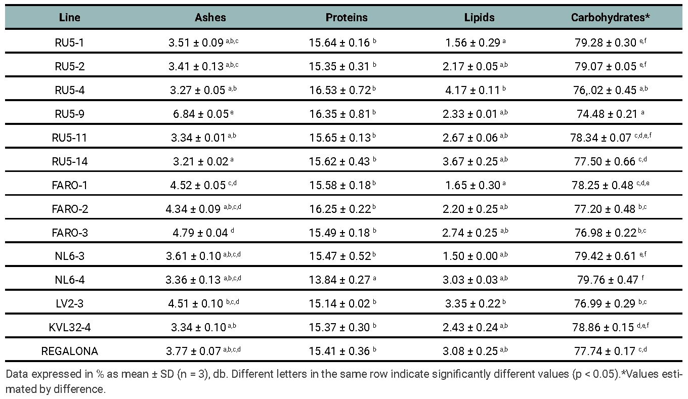 Table 2 shows the results from the compositional analysis of the different lines of quinoa studied in this work. Some values extracted from the bibliography corresponding to this same species, amaranth (Amaranthus spp.), and the main cereals of intensive cultivation worldwide are shown in table 3. Carbohydrates represented the main fraction of the quinoa grains, and the NL6-4 presented the highest value among the grain samples studied (mean content 79.76%, dry basis). Carbohydrates in quinoa resulted in higher levels than amaranth (62.2%) and wheat (72.5%) but lower than rice (89.8%).