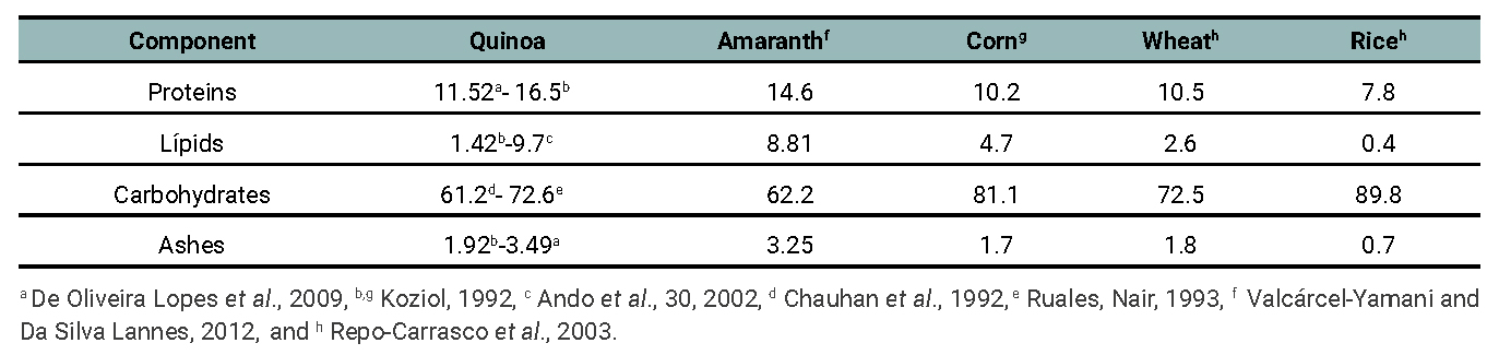 ALVAREZ-JUBETE, L.; ARENDT, E.K.; GALLAGHER, E. 2009. Nutritive value and chemical composition of pseudocereals as gluten free ingredients. Int. J. Food Sci. Nutr. 60, 240-257. https://doi.org/10.1080/09637480902950597