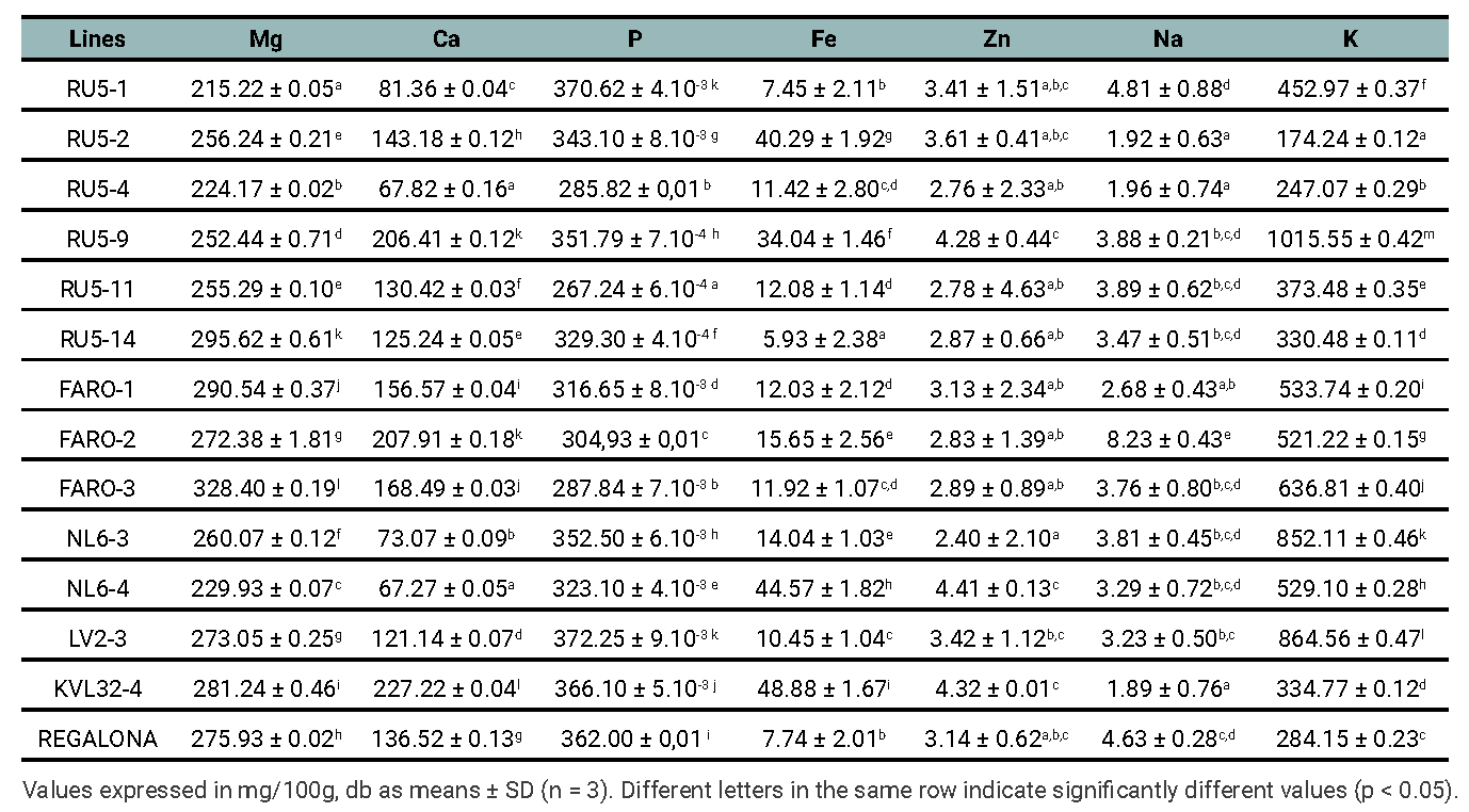 Concerning the in vitro antioxidant activity, table 6 presents the results assessed by the DPPH method corresponding to the quinoa grains of the 14 lines. Maximum and minimum levels corresponded to RU5-1 and NL6-4 (436.58 and 657.11 µmol ET/100 g, respectively). Other authors have found values for this parameter varying in a broad range. So, Vollmannova et al. (2013) studied five quinoa genotypes in which the antioxidant activity values ranged between 260 and 1240 µmol TE/100g. Moreover, Mamani Coaquira (2015) analyzed two varieties of quinoa from Peru with values of 121.1 and 279.4 µmol ET/100g. The reported differences in the values obtained by this method can be affected by factors concerning the nature of the sample e itself, like quinoa variety, cultivar, climate, agricultural conditions of cultivation, harvest, processing, and storage, as well as analytical variables inherent to the DPPH method, such as pH, metal ion presence and freshness of the reactive (Dawidowicz et al., 2012; Kedare and Singh, 2011; Musa et al., 2013).