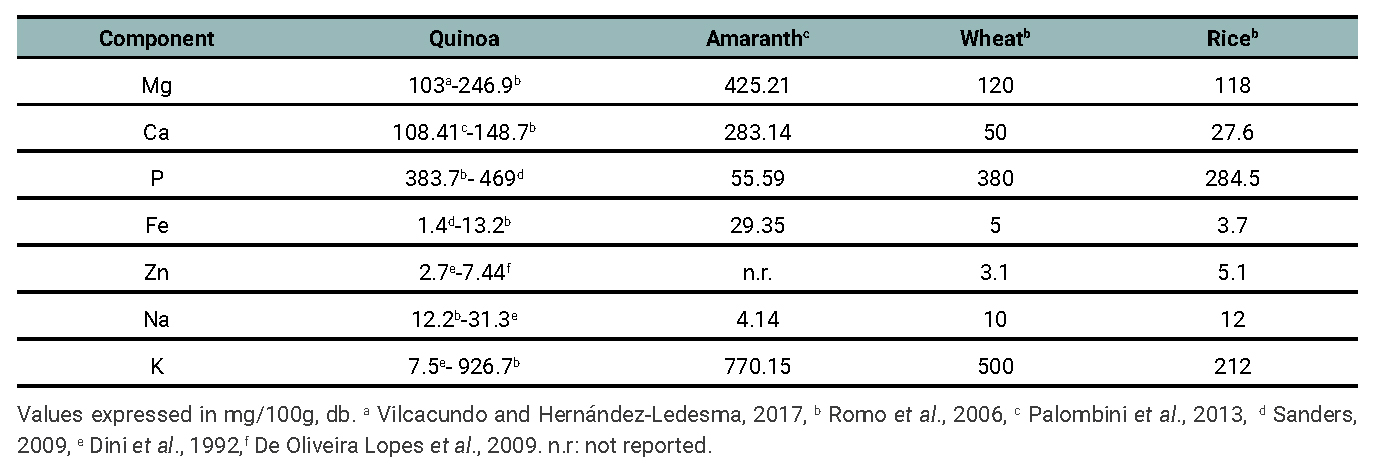 Some values of mineral elemental composition of quinoa, amaranth, wheat, and rice reported in the literature.