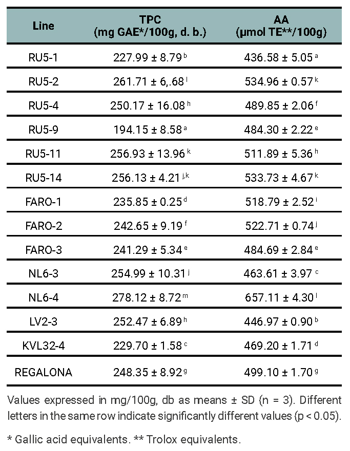 Total phenolic content (TPC) and in vitro antioxidant activity (AA) of the quinoa lines.