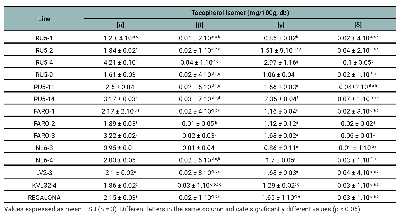 Main tocopherol contents in the lipidic fraction of grains from the selected quinoa lines.