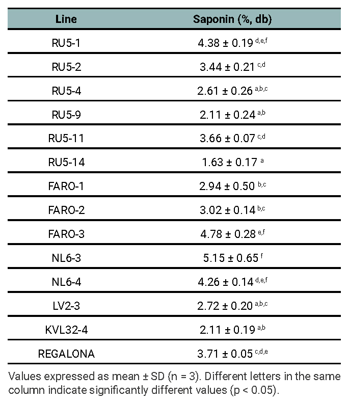 The saponin contents of the quinoa lines studied agreed with other values reported in the bibliography. Stuardo and San Martín (2008) determined saponin concentrations in the 0.1 to 5% range in quinoa grain samples from Bolivia. In another study, the total level of saponins in Chilean Criolla variety grains of quinoa was between 1% and 4%, with maximum values corresponding to samples from the central region of the country (Miranda et al., 2012). Moreover, Troisi et al. (2013) evaluated eight commercial varieties of quinoa from different regions of South America, demonstrating that the Pink variety from Jujuy province (Argentina) turned out to be the richest variety in saponins with a value of 4.99% while the Real variety from Bolivia presented a minimum level of 0.1%.